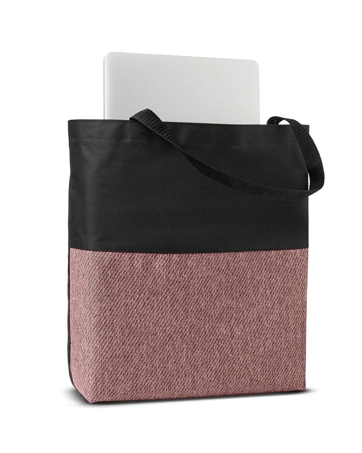600D Polyester tote bag with open main compartment and interior padded laptop compartment (holds most laptops up to 14″) with hook and loop style closure. Features twill front with black top and backside. Front zipper pocket measured approx. 8.5″w x 9.5″h. Carry handles measure approx. 23″l x 0.875″w. Recommended weight tolerance: 22 lbs. 17.5000″ W x 15.0000″ H x 2.5000″ D